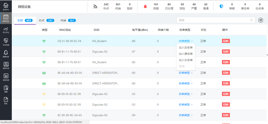 1)監(jiān)控?zé)o線設(shè)備實(shí)時(shí)信息(數(shù)量、類型、頻段信道、信號(hào)強(qiáng)度、SSID名稱、MAC地址、告警狀態(tài))