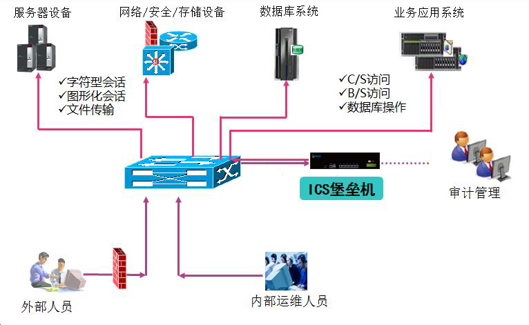 ICS堡壘機基于數(shù)據(jù)中心運維安全管理角度出發(fā),通過集中化運維管控、統(tǒng)一運維管理、身份認證與權(quán)限控制、運維訪問合規(guī)性控制、運維過程實時監(jiān)看、運維過程全程審計、自定義應(yīng)用發(fā)布等功能,為數(shù)據(jù)中心運維構(gòu)建一套事前預(yù)防、事中監(jiān)控、事后審計完善的安全管理體系。